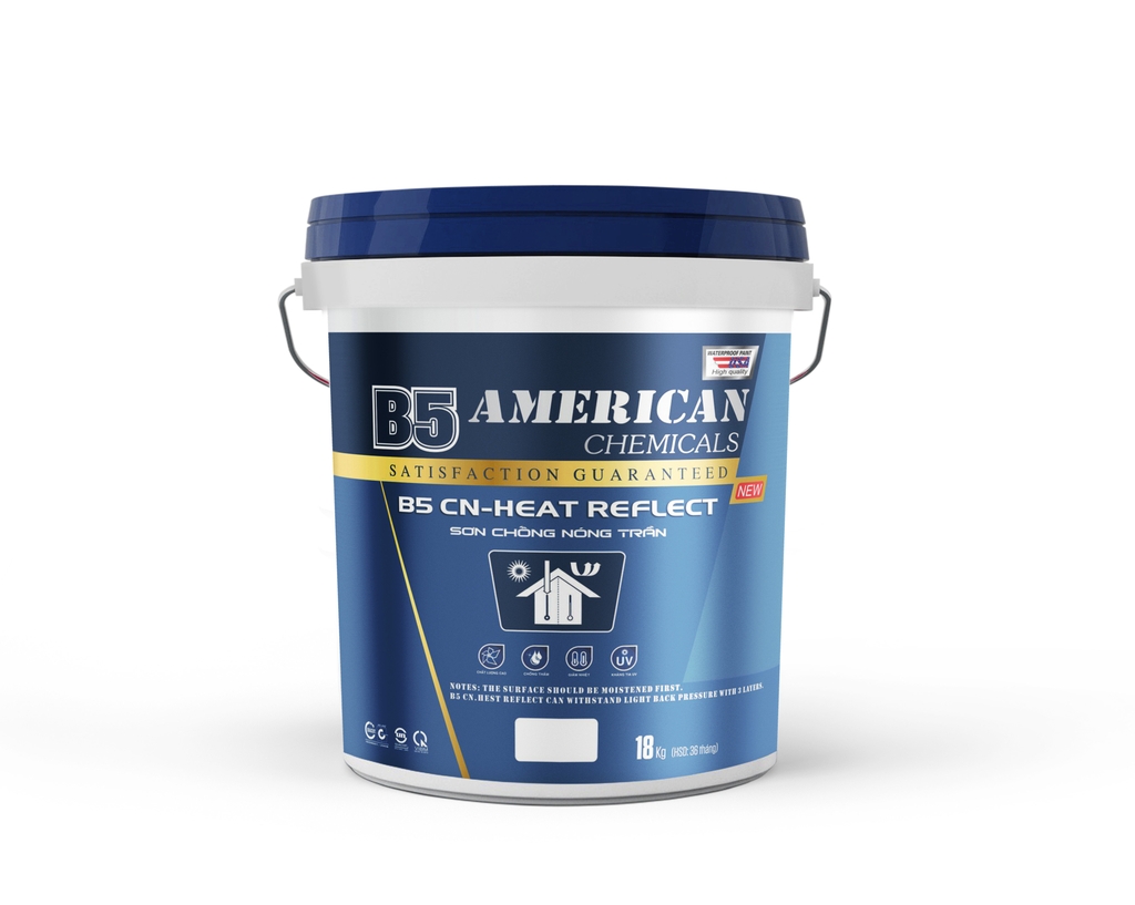 B5 CN – Heat Reflect là loại sơn chống nóng cho trần, mái, gạch, ngói được chế tạo từ loại nhựa poly urethan biến tính đặc biệt, cho màng sơn dẻo dai, bám dính tốt, kháng nước, kháng kiềm, kháng UV rất tốt . Đặc biệt là màng sơn bám dính rất tốt ngay cả trên nền gạch, đá nên rất thích hợp sơn cho sàn mái bê tông, sân thượng và các bề mặt lộ thiên.